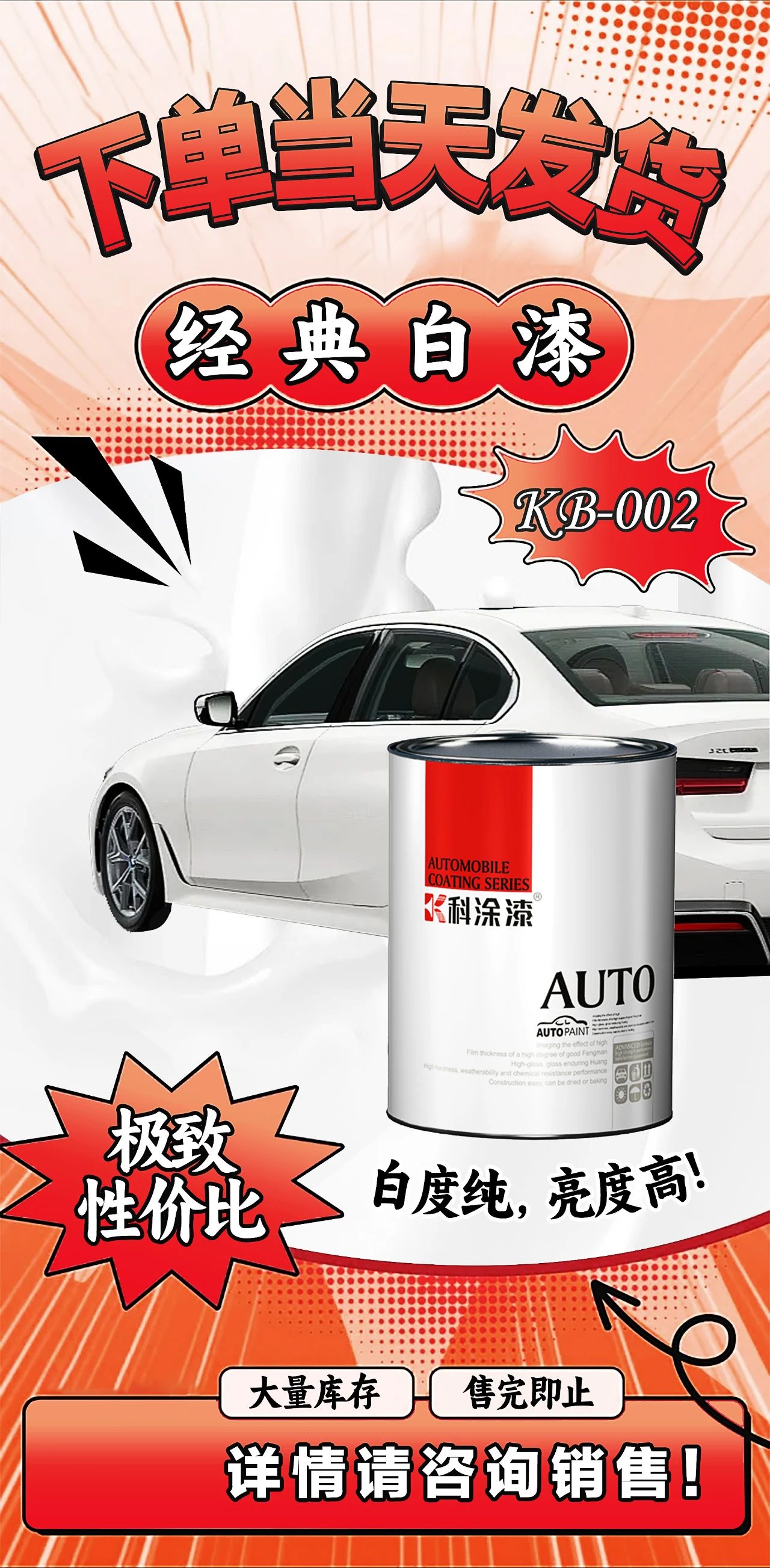 002白漆是主打明星产品之一,属于高浓度白色,具有黏度高、光泽好、流平度佳等特点;其漆膜饱满度佳,有效保护你的爱车光亮如新、白度始终如一。