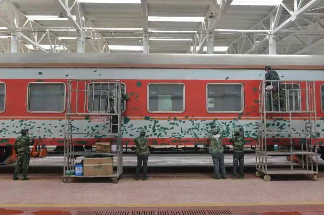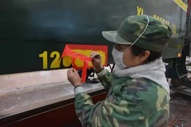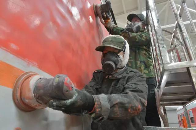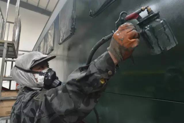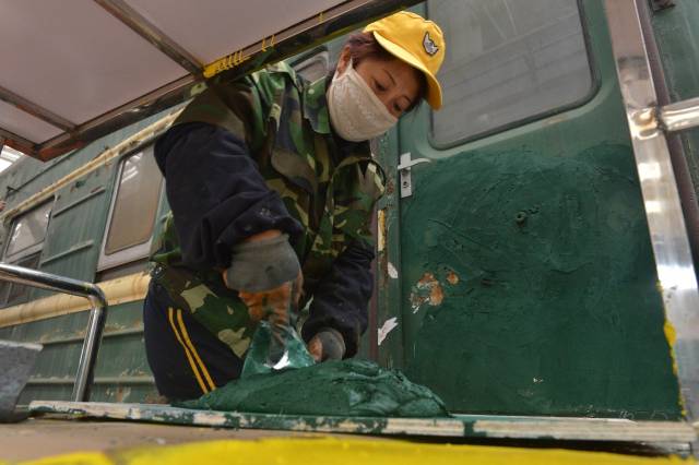 一辆客车从入库到面貌一新出库,需经历铲车皮、刮腻子、打磨、喷漆、刷腰线、涂刷列车上各种标识等十几道工序,大约要5天时间。包头车辆段检修车间油漆组每天负责4至5辆车的油漆喷涂工作,女工们分为几个小组,每个小组承包一辆车。